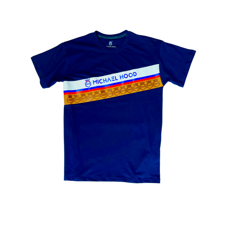 Five Colors Printed Logo Designs On Navy Blue Tee And Short Set MICHAEL HOOD